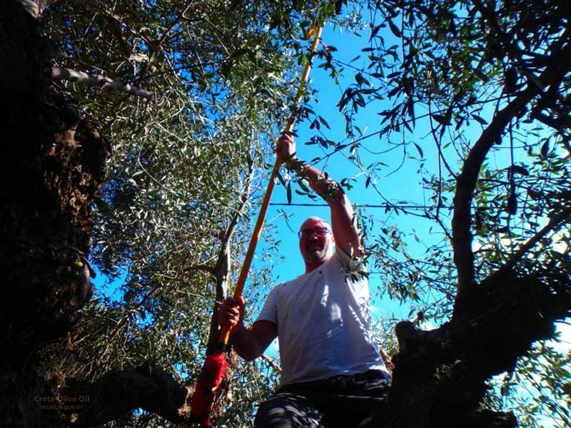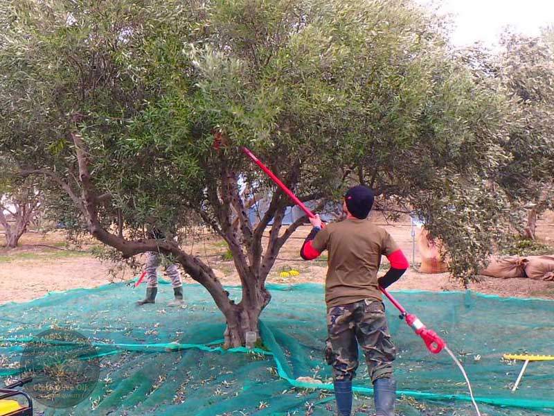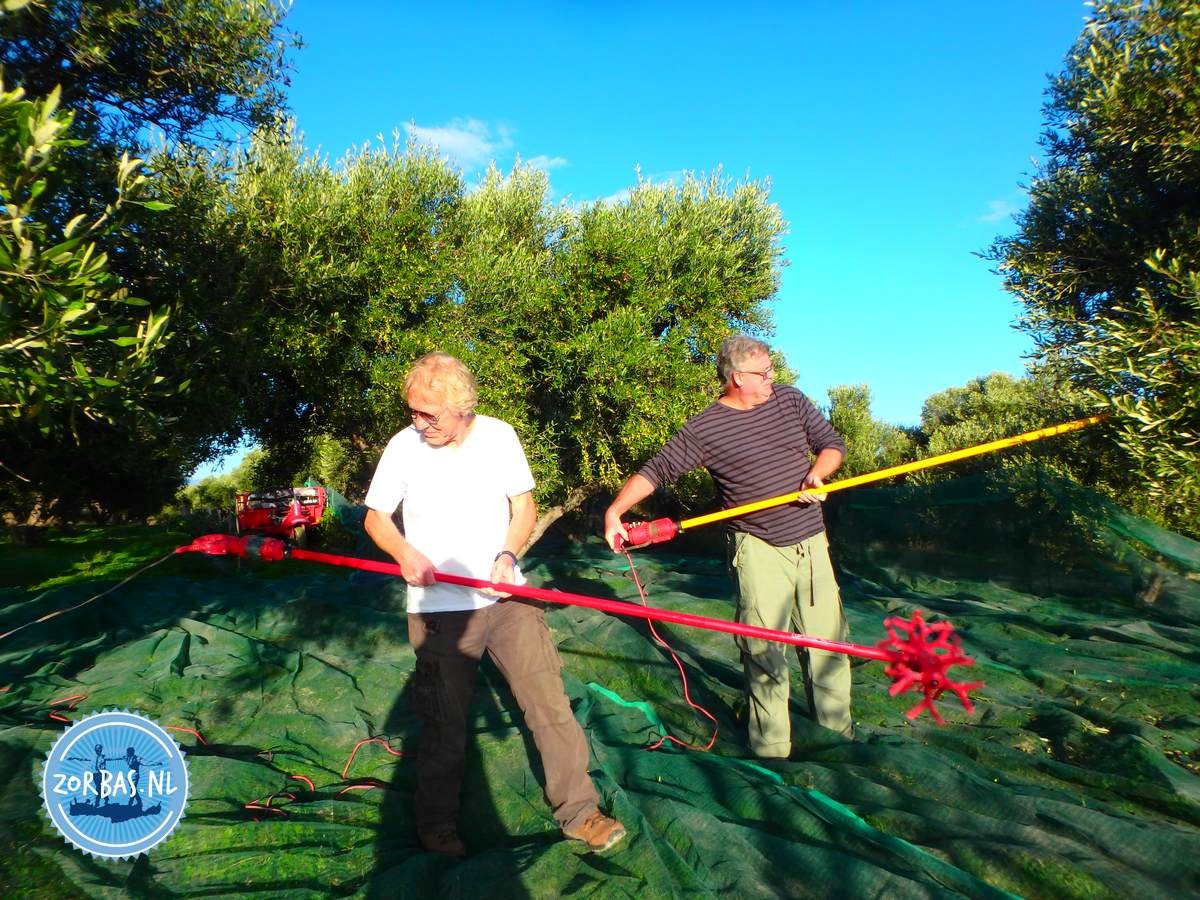 In het begin worden de netten onder de olijfbomen gelegd en worden de oogststokken met de stroomgenerator verbonden. Nu kan de oogst van olijven beginnen. De roterende koppen van de stokjes gaan met een op en neer gaande beweging door de takken van de olijfboom. De olijven vallen als regendruppels op de netten het regent letterlijk olijven. Vervolgens worden de olijven vanuit de netten in een schudapparaat geplaatst en door schudden worden veel bladeren en een kleine takjes uitgesorteerd. De olijven vallen aan de zijkant in een zak, die later naar de olijffabriek wordt gebracht om te worden geperst. Een volle zak olijven weegt ongeveer 50 kilo.