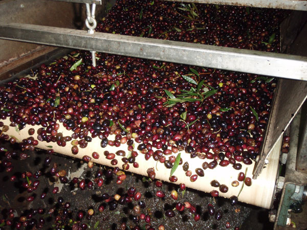 De volle en zware zakken worden vervolgens naar de fabriek getransporteerd en er wordt een afspraak gemaakt voor het moment van het persen. Op de dag van het persen worden de zakken geopend en vallen de olijven in een trechter. De olijven worden gereinigd via een transportband en gaan door naar de pers.